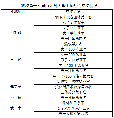 11月12日,随着最后一个赛项—“羽毛球比赛”项目的结束,山东省第十七届大学生运动会落下帷幕。经过为期两个多月、两百多场次的角逐鏖战,我校代表团夺得了1金5银2铜的骄人成绩,展现了我校运动健儿良好的精神面貌,实现了运动成绩和精神文明“双丰收”。