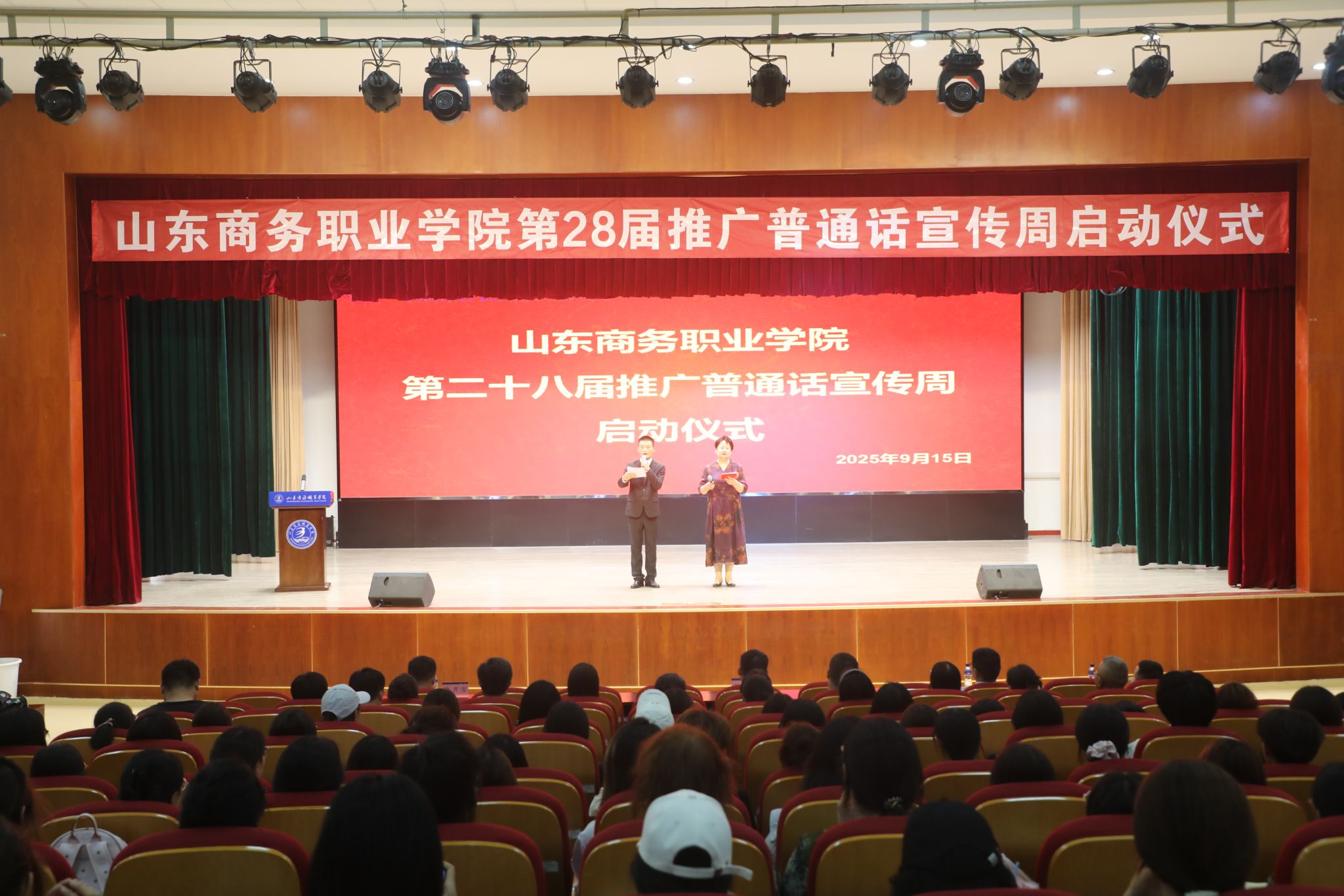9月15日下午,我校第28届推广普通话宣传周启动仪式在音乐厅顺利举行。学校副校长孙玉林、宣传统战部部长孙芹宝,以及基础教学部、各二级学院相关负责人和师生代表共同参加了本次活动。