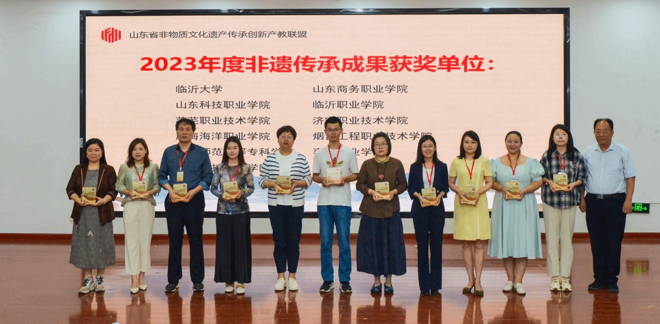 6月5日,山东省非物质文化遗产传承创新产教联盟年会暨第十届优秀传统文化进校园系列活动在临沂职业学院隆重举行,我部张洁老师提报的《遗传承助力“六位一体”传统文化育人体系的构建》项目喜获“2023年度非遗传承成果奖”。